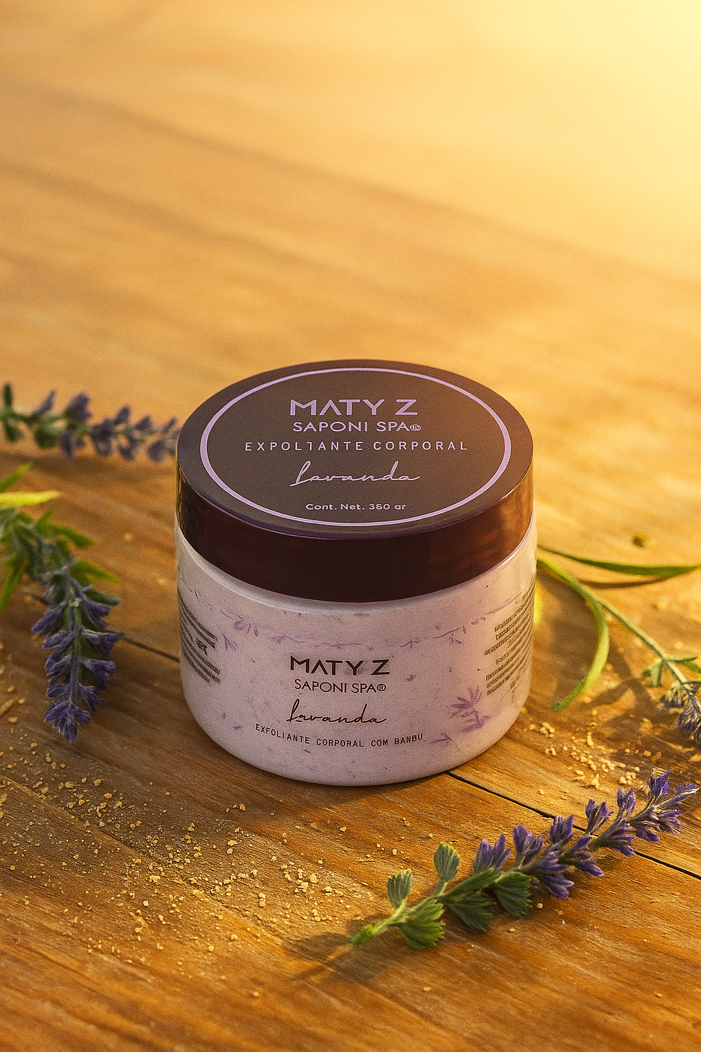 Manteca de Karité, manteca de mango, aceite de coco, aceite de pepita de uva, azúcar morena y aceite esencial de lavanda.
