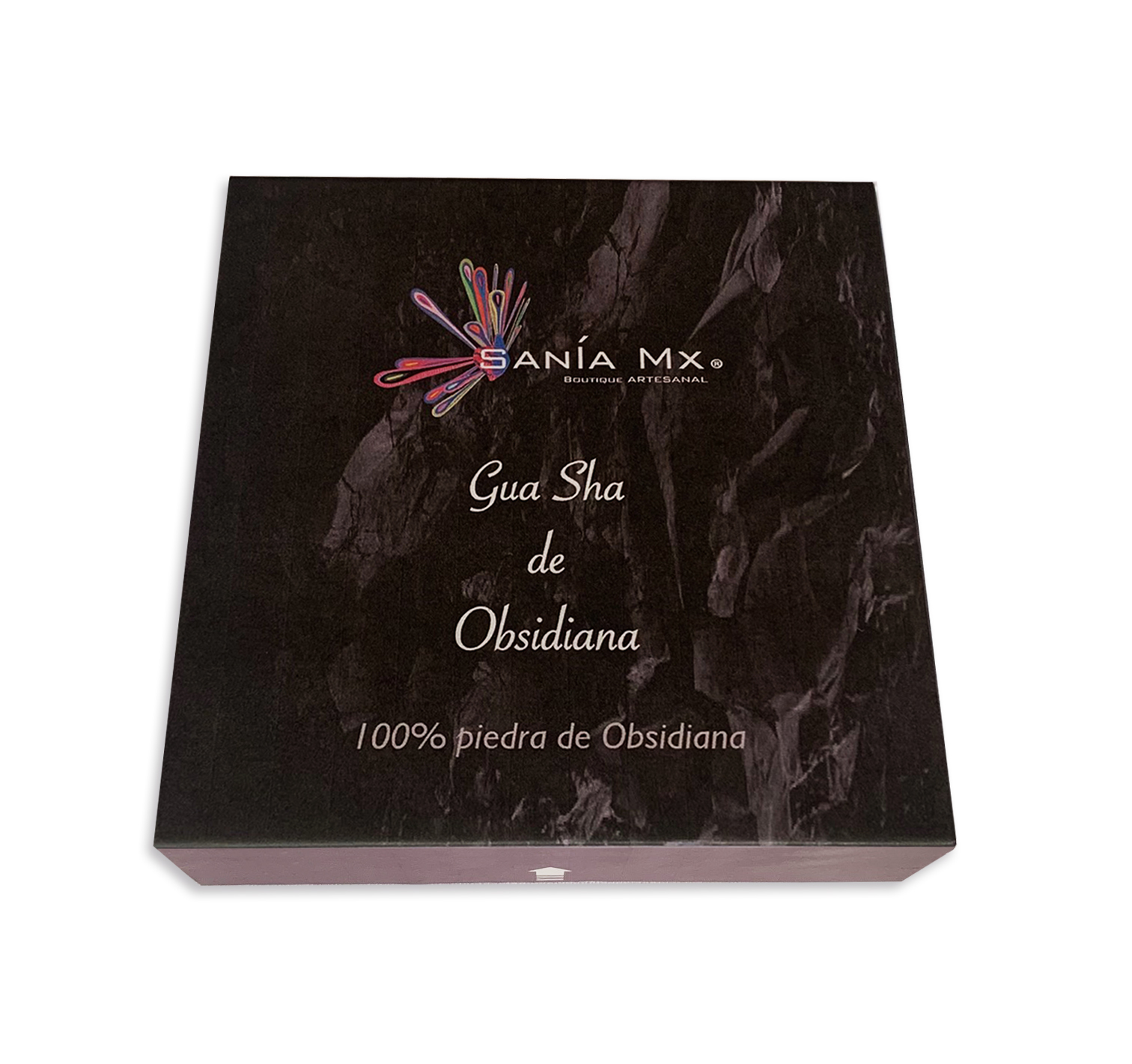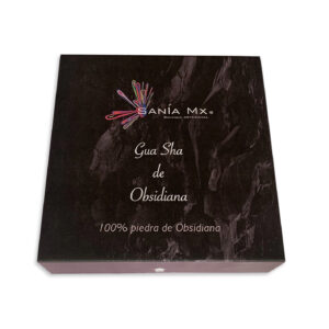 1 Gua Sha de Obsidiana, estuche rígido para conservarla y saquito de tela para guardarla.
