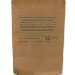 Bicarbonato de sodio, Sal de Epsom, Ácido Cítrico, aceite esencial de Menta, aceite esencial de Eucalipto y hierbas secas de Hierbabuena.