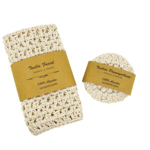 Incluye productos hechos a mano: Toalla de mano tejida 100% algodón, suaves discos desmaquillantes reutilizables y una vela de cera de soya en lata.